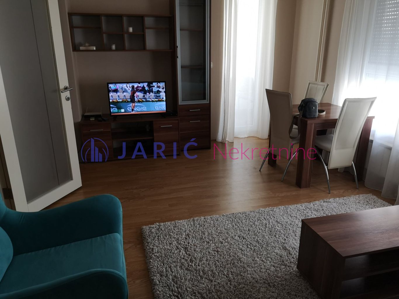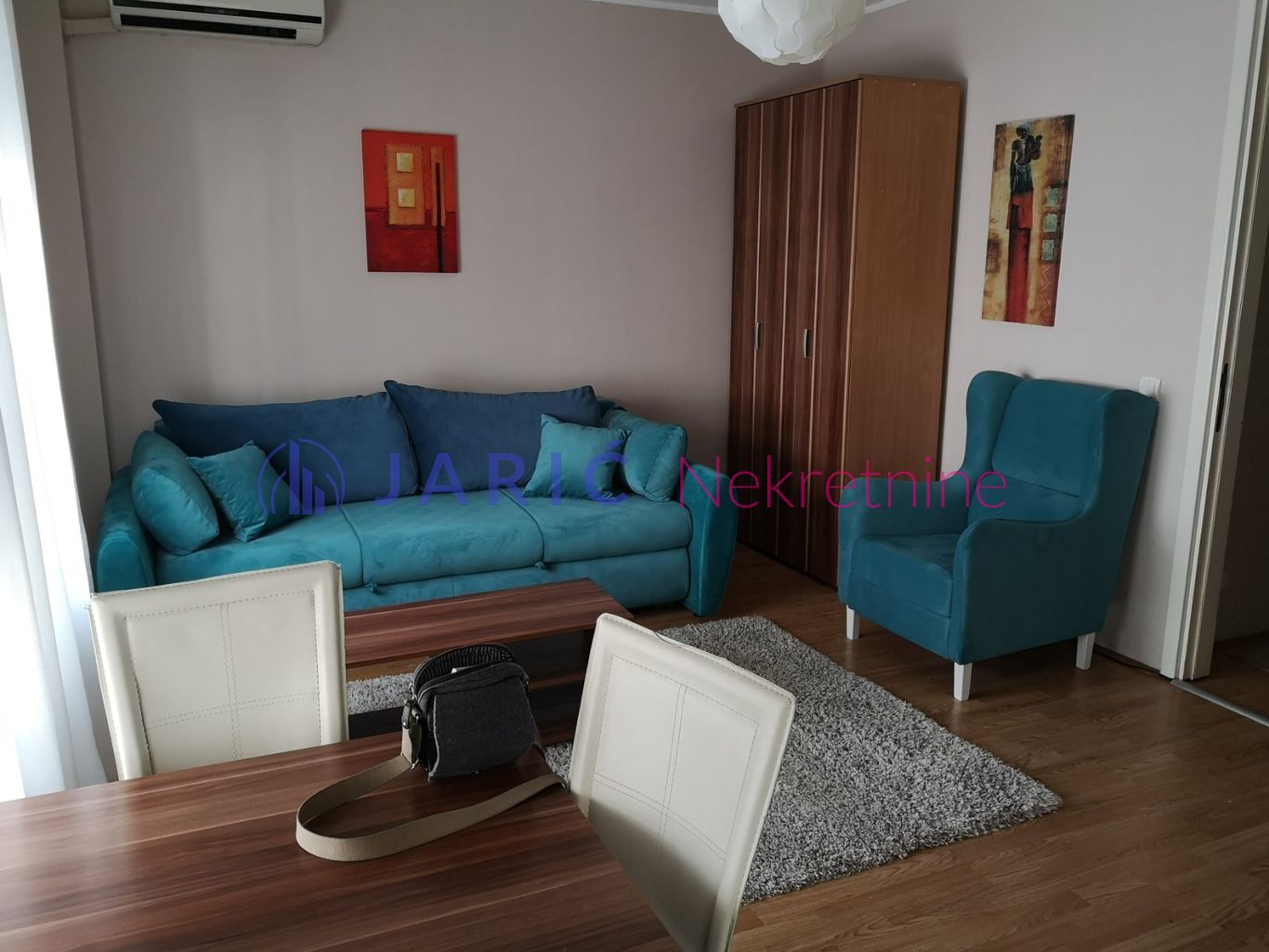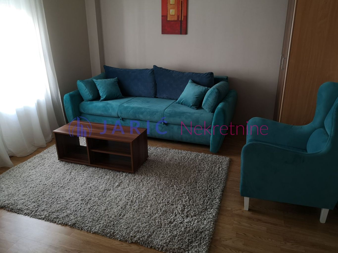 Stan je potpuno namešten modernim komadima nameštaja i opremljen svom belom tehnikom, uključujući i kuhinjske dodatke. Veliki američki plakari pružaju dovoljno prostora za odlaganje, čineći prostor organizovanim i funkcionalnim.